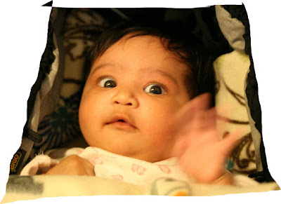 This belongs to the times when she had just started to please with her endless smiles. This one is special for us since we did not have to trick her into smiling, she actually gave a giant grin to Lakshmi and we managed to capture the smile that ended the grin ! Well sometimes we are surprised as to what can bring that million dollar worth grin, it could be a simple piece of furniture lying harmlessly in the house or sometimes the conscious efforts of her hapless parents. Nonetheless we are glad !